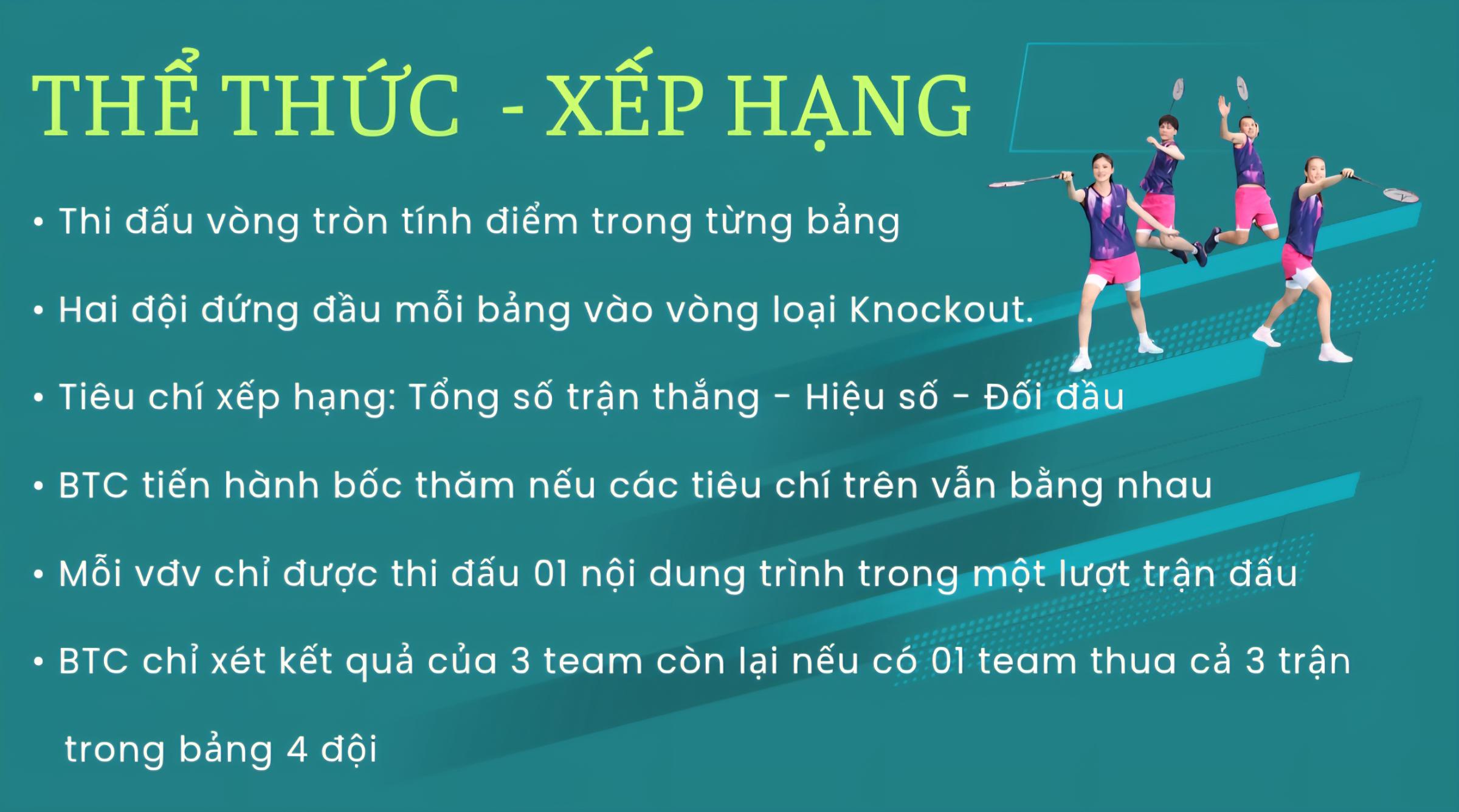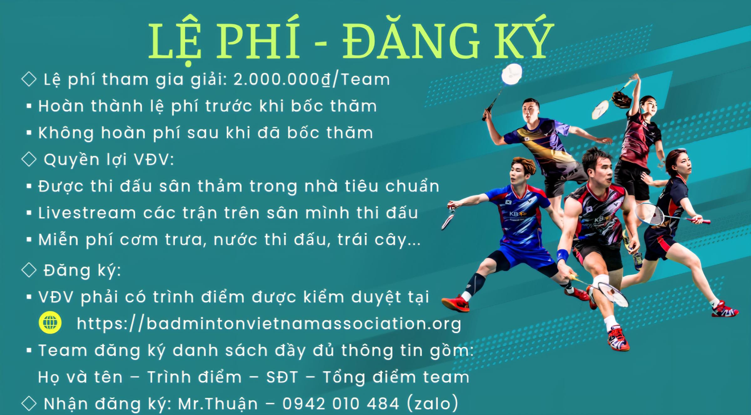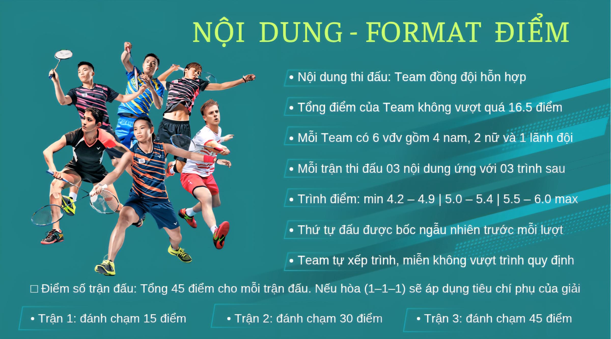 • Team đăng ký tham gia gồm các vđv đã có trình điểm được BTC kiểm duyệt trên website https://badmintonvietnamassociation.org