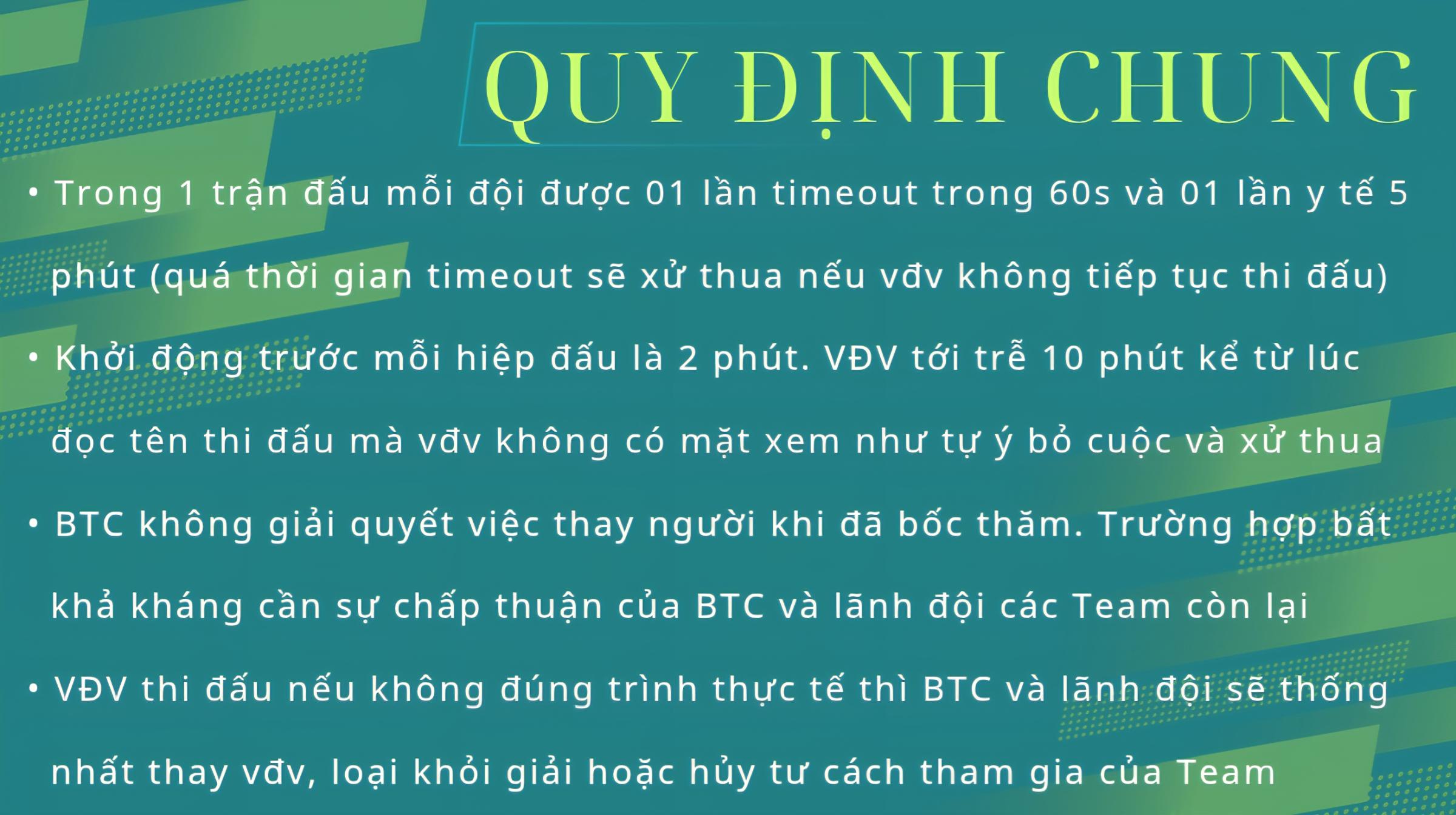 • VĐV thi đấu nếu không đúng trình thực tế thì BTC và lãnh đội sẽ thống nhất thay vđv, loại khỏi giải hoặc hủy tư cách tham gia của Team
