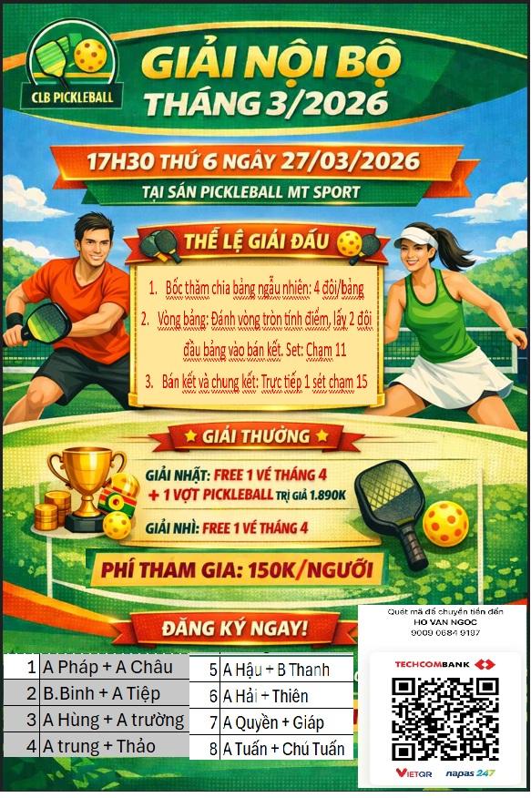 Giải nội bộ tháng 3/2026 Pickleball MT Sport
