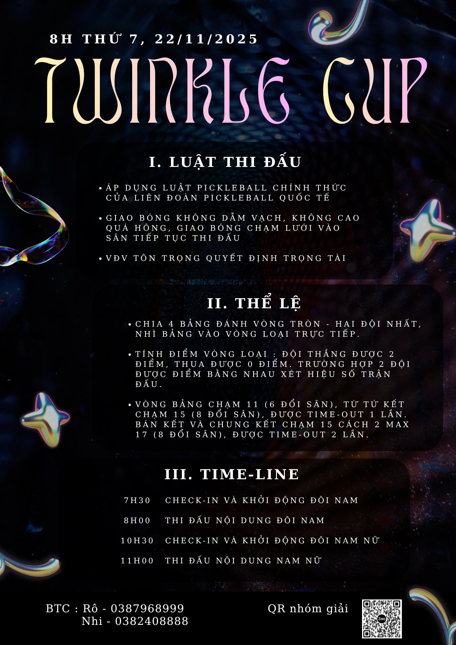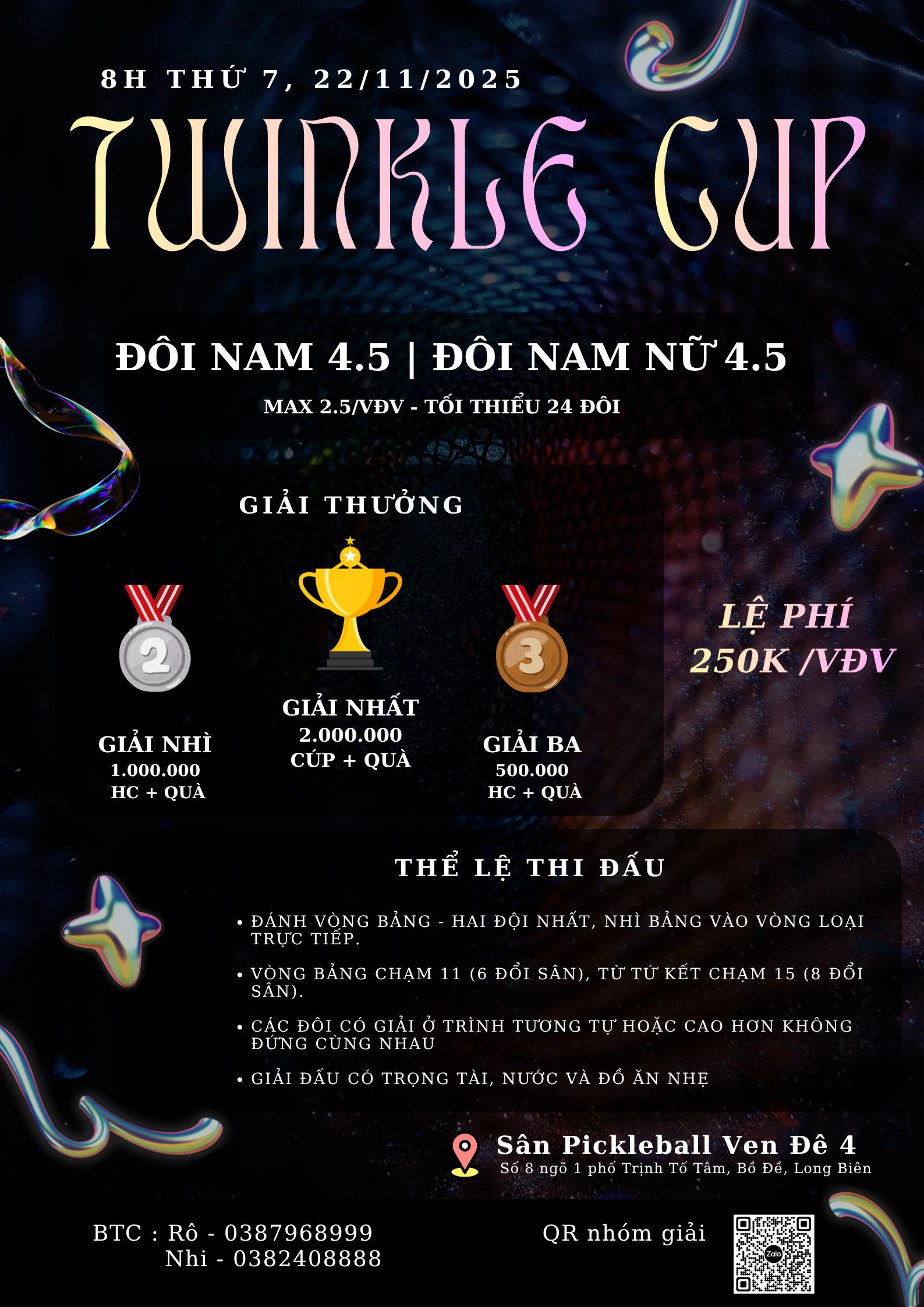 Nhằm tạo sân chơi giao lưu, học hỏi và kết nối cộng đồng Pickleball Hà Nội, TWINKLE CUP PICKLEBALL trân trọng kính mời các anh chị, bạn bè đam mê bộ môn tham gia giải đấu lần này!